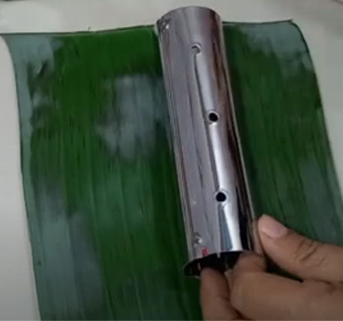 Rol een stuk bananenblad in de vorm, zorg ervoor dat de bananenblad goed aansluit.