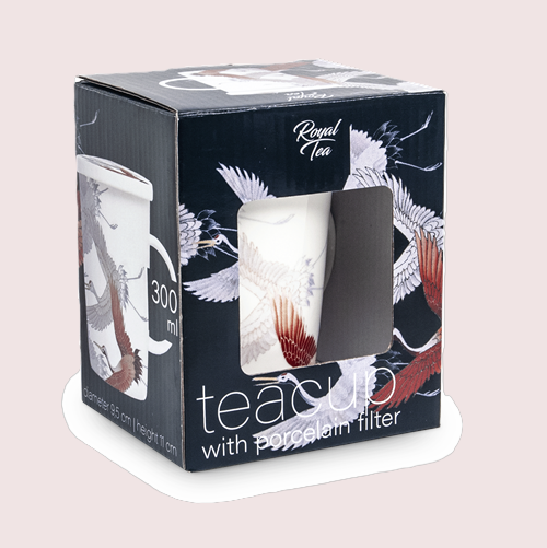 De theekop heeft een inhoud van 350 ml, en de geïntegreerde filter heeft een diameter van 9,5 cm en een hoogte van 11 cm. De porseleinen filter zorgt ervoor dat je thee altijd puur en zonder bladeren wordt geserveerd, zodat je volledig kunt genieten van je theemoment.